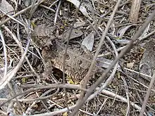 The Texas horned lizard (Phrynosoma cornutum) is one of about 21 North American species of spikey-bodied reptiles called horned lizards, all belonging the genus Phrynosoma.[2] It occurs in south-central regions of the US and northeastern Mexico, as well as several isolated introduced records and populations from Southern United States. Though some populations are stable, severe population declines have occurred in many areas of Texas and Oklahoma.[1][3] The Texas spiny lizard (Sceloporus olivaceus) may be confused for a Texas horned lizard due to its appearance and overlapping habitat.[4]