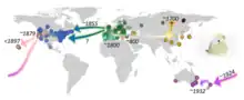 - ↑ Ryan, S.F.; et al. (2019). "Global invasion history of the agricultural pest butterfly Pieris rapae revealed with genomics and citizen science". PNAS. 116 (40): 20015–20024. Bibcode:2019PNAS..11620015R. doi:10.1073/pnas.1907492116. PMC 6778179. PMID 31506352.