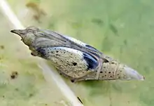 The pupa of P. rapae is very similar to that of P. napi. It is brown to mottled-gray or yellowish, matching the background color. It has a large head cone, with a vertical abdomen and flared subdorsal ridge.[8] The two (pupa of P. rapae and P. napi) can be easily distinguished by comparing the proboscis sheath. In P. rapae, the proboscis sheath extends far beyond the antennal sheath while in P. napi, only a very short distance.[13]