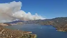 View of the smoke plume of the Pilot Fire, with Silverwood Lake in foreground, August 07.