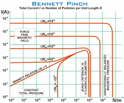 The Carlqvist relation can be illustrated (see right), showing the total current (I) versus the number of particles per unit length (N) in a Bennett pinch. The chart illustrates four physically distinct regions. The plasma temperature is quite cold (Ti = Te = Tn = 20 K), containing mainly hydrogen with a mean particle mass 3×10−27 kg. The thermokinetic energy Wk >> πa2 pk(a). The curves, ΔWBz show different amounts of excess magnetic energy per unit length due to the axial magnetic field Bz. The plasma is assumed to be non-rotational, and the kinetic pressure at the edges is much smaller than inside.