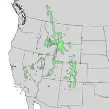 The largest part of the limber pine's range is in the Rocky Mountains, from southwest Alberta[7] and southeastern British Columbia south through Colorado and New Mexico into the northern states of Mexico. It is also found through the Great Basin[7] states of Nevada and Utah, in the eastern Sierra Nevada and White Mountains of Northern California, and in the San Bernardino and San Gabriel Mountains of the Transverse Ranges in Southern California. Continuing south the species is found in the San Jacinto Mountains, Santa Rosa Mountains, and Hot Springs Mountain of the Peninsular Ranges. There are small disjunct populations in eastern Oregon, in western North Dakota and Nebraska,[12] and in the Black Hills of South Dakota.[2][8] It is found at a wide range of altitudes depending on the latitude, from 850 to 3,810 m (2,790 to 12,500 ft). In the northern half of its range, it grows in the montane zone near the lower tree line; in the middle of its range between the 45th and 40th parallels, it grows on windswept sites in the montane and subalpine zones; and in the southern part of its range, it grows mainly at high elevations in the subalpine zone near the upper tree line.[12] It can more often be found at the outer fringes of a forest than in the forest itself.[7]