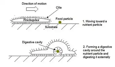 The lower surface engulfs small particles of organic detritus, on which the animal feeds. All placozoa can reproduce asexually, budding off smaller individuals, and the lower surface may also bud off eggs into the mesenchyme.[11] Sexual reproduction has been reported to occur in one clade of placozoans,[38][39] whose strain H8 was later found to belong to genus Cladtertia,[2] where intergenic recombination was observed as well as other hallmarks of sexual reproduction.