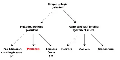 The Placozoa descending side by side with the sponges, cnidarians and ctenophores from a gallertoid by processes of differentiation