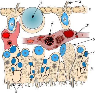 Placozoans have only three anatomical parts as tissue layers inside its body: the upper, intermediate (middle) and lower epithelia. There are at least six different cell types.[32] The upper epithelium is the thinnest portion and essentially comprises flat cells with their cell body hanging underneath the surface, and each cell having a cilium.[33] Crystal cells are sparsely distributed near the marginal edge. Few cells have unusually large number of mitochondria.[32] The middle layer is the thickest made up of numerous fiber cells, which contain mitochondrial complexes, vacuoles and endosymbiotic bacteria in the endoplasmic reticulum. The lower epithelium consists of numerous monociliated cylinder cells along with a few endocrine-like gland cells and lipophil cells. Each lipophil cell contains numerous middle-sized granules, one of which is a secretory granule.[34][33]