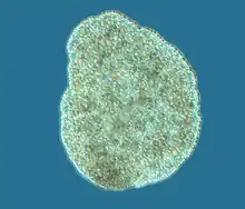 Placozoans do not have well-defined body plan much like amoebas, unicellular eukaryotes. As Andrew Masterson reported: "they are as close as it is possible to get to being simply a little living blob."[28] An individual body measures about 0.55 mm in diameter.[29] There are no body parts; as one of the researchers Michael Eitel described: "There's no mouth, there's no back, no nerve cells, nothing."[30] Animals studied in laboratories have bodies consisting of everything from hundreds to millions of cells.[31]
