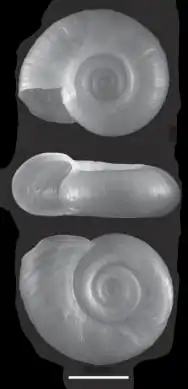 The side of the shell which is in fact the spire (a sunken spire) faces down in the living animal, contrary to what is the case in almost all other shelled gastropods. Because the shell is carried "upside down" like this, the aperture of the shell is angled to face downwards also, so the aperture faces a little towards the spire, not away from it, as is usually the case in other shelled gastropods.