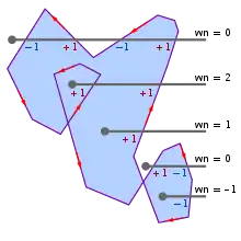 Another technique used to check if a point is inside a polygon is to compute the given point's winding number with respect to the polygon. If the winding number is non-zero, the point lies inside the polygon. This algorithm is sometimes also known as the nonzero-rule algorithm.