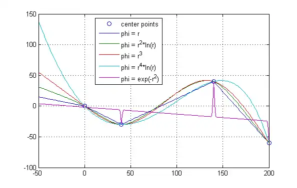The next figure shows the interpolation through four points (marked by "circles") using different types of polyharmonic splines. The "curvature" of the interpolated curves grows with the order of the spline and the extrapolation at the left boundary (x < 0) is reasonable. The figure also includes the radial basis functions φ = exp(−r2) which gives a good interpolation as well. Finally, the figure includes also the non-polyharmonic spline phi = r2 to demonstrate, that this radial basis function is not able to pass through the predefined points (the linear equation has no solution and is solved in a least squares sense).