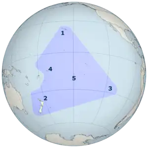The Polynesian Triangle is a geographical region of the Pacific Ocean with Hawaii (Hawaiʻi) (1), New Zealand (Aotearoa) (2) and Easter Island (Rapa Nui) (3) at its corners, but excluding Fiji on its western side. At the center is Tahiti (5), with Samoa (4) to the west.