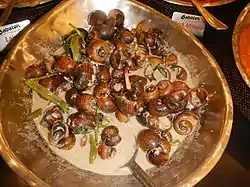 Some French restaurants are trying to use Pomacea canaliculata as an alternative to escargot.[30] After boiling, remove Pomacea canaliculata guts and eggs. Washing only the muscular body with vinegar will eliminate the odor. As a result, it can be used as an alternative to escargot.[31]