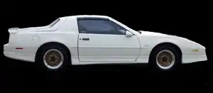 The new Firebird shrank to a 101-inch wheelbase, losing more than 8 inches in overall length, measured about an inch narrower, and weighed nearly 500 lb (227 kg) less than its 1981 predecessor. It also was the most aerodynamic production Firebird to date with a drag coefficient of 0.33. The new Trans Am took things a bit further, with a coefficient of .32.[6] The Trans Am body would continue to improve aerodynamically over the years, and by 1985 would be the most aerodynamic vehicle to ever be released from General Motors with a 0.29 coefficient of drag. Wind tunnels were used to form the third-generation F-Body's shape, and these aerodynamic developments were fully taken advantage of by Pontiac's design team. The sleek new car had a low slung front end which featured split grilles. They fed some air to the radiator but most of the air came from an air dam underneath the front bumper. Every piece of the car was designed to reduce drag. The newly designed side view mirror housings, made of light alloy metal, were almost cone shaped, with the point facing the wind. The windshield wipers were hidden under the hood with the air intake for the climate control system. It made for a smooth flow of air over the windshield. The retractable headlamps popped up from the leading edge of the hood. The cars tended to outlive the plastic gears for the headlight doors, and since the dealers charged several hundred dollars for the repair, it was common to see Firebirds driving around with one or both headlights stuck open during the day. Smooth wheelcovers were available on the Trans Am, attached to turbine finned alloy wheels. A frameless, flush-mounted, compound curved rear glass hatchback decklid provided 30.9 cu ft (0.87 m3). of cargo space with the rear seats folded, and an optional wiper.[7] It provided no disturbance to the airflow over the back of the car. All of these features combined to provide a low coefficient of drag. The front end of the vehicle featured 10.5-inch (270 mm) power disc brakes and were now standard on all Firebird models. Taking styling cues from the 1981 design, the new car had full width tail lights, complete with a Firebird emblem in the center. The all-new suspension design was more advanced and aggressive than anything Detroit had offered previously, easily rivaling the Corvette's handling abilities, (but not its sophistication). The front suspension utilized MacPherson struts, with inboard mounted coil springs and lower front control arms. In the rear, coil springs and shocks were positioned between the body and solid rear axle, with twin rear lower control arms/trailing links and a torsion bar, replacing the old-fashioned leaf springs design used previously in the 2nd generation Firebird. A huge torque arm was mounted from the transmissions tailshaft to the rear axle center to further stabilize the axle's tendency to twist.