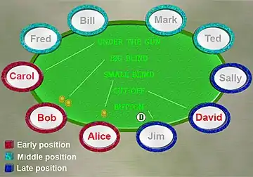 Position in poker refers to the order in which players are seated around the table and the related poker strategy implications. Players who act first are in "early position"; players who act later are in "late position"; players who act in between are in "middle position".[1] A player "has position" on opponents acting before him and is "out of position" to opponents acting after him.[2] Because players act in clockwise order, a player "has position" on opponents seated to his right, except when the opponent has the button and certain cases in the first betting round of games with blinds.