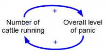 Positive feedback (exacerbating feedback, self-reinforcing feedback) is a process that occurs in a feedback loop which exacerbates the effects of a small disturbance. That is, the effects of a perturbation on a system include an increase in the magnitude of the perturbation.[1] That is, A produces more of B which in turn produces more of A.[2] In contrast, a system in which the results of a change act to reduce or counteract it has negative feedback.[1][3] Both concepts play an important role in science and engineering, including biology, chemistry, and cybernetics.