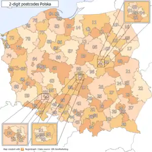 The first digit of a Polish postal code specifies the large area (postal region) to which the address concerned belongs. The numbers run clockwise around the map of Poland, from Warsaw (0) in the central east of the country, through east, south, west and north and then back to Łódź (9), close to the geographical centre of Poland. Each region is operated by one of the Poczta Polska's regional divisions (oddział regionalny), located in the following cities: