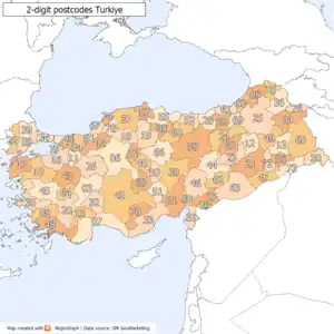 Postal codes in Turkey (Turkish: Posta kodu) consist of five digits starting with the two digit license plate code of the provinces followed by three digits to specify the location within the districts of the province.