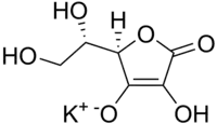 Potassium ascorbate is a compound with formula KC6H7O6. It is the potassium salt of ascorbic acid (vitamin C) and a mineral ascorbate. As a food additive, it has E number E303, INS number 303. Although it is not a permitted food additive in the UK, USA and the EU,[2][3] it is approved for use in Australia and New Zealand.[4] According to some studies, it has shown a strong antioxidant activity and antitumoral properties.[5][6][7]