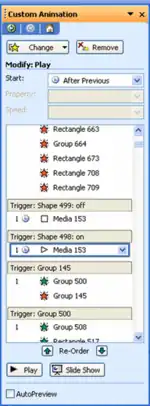 - ↑ "Creating Animation Sequences in PowerPoint 2002 and PowerPoint 2003". Microsoft Corporation. Retrieved 2007-03-10.