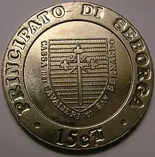 Seborga's local currency, the Seborga luigino, is divided into 100 cents. Luigini coins circulate in Seborga alongside the euro. The currency has no value outside of the town. The value of the luigino is pegged to the US dollar at SPL 1 = USD 6.00.[18] On 20 August 2023 the Principality presented the first banknote ever of the luigini.[19]