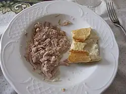 Pringá is a Spanish dish popular in Andalusia. It consists of roast beef or pork, cured sausages such as chorizo and morcilla, and beef or pork fat slow-cooked for many hours until the meat falls apart easily. Pieces of crusty bread are used to pull away a little meat, sausage, and fat. It is a social dish eaten around the family dinner table.[1]