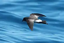 Most albatrosses and procellariids use two techniques to minimise exertion while flying, namely, dynamic soaring and slope soaring. The albatrosses and giant petrels share a morphological adaptation to aid in flight, a sheet of tendon which locks the wing when fully extended, allowing the wing to be kept up and out without any muscle effort.[48] Amongst the Oceanitinae storm-petrels there are two unique flight patterns, one being surface pattering. In this they move across the water surface holding and moving their feet on the water's surface while holding steady above the water, and remaining stationary by hovering with rapid fluttering or by using the wind to anchor themselves in place.[49] A similar flight method is thought to have been used by the extinct petrel family Diomedeoididae.[23] The white-faced storm petrel possesses a unique variation on pattering: holding its wings motionless and at an angle into the wind, it pushes itself off the water's surface in a succession of bounding jumps.[50]