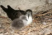 A semi-precocial wedge-tailed shearwater chick with guarding parent