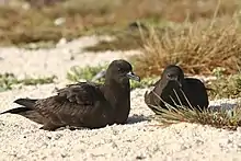 All procellariiforms are colonial, predominantly breeding on offshore or oceanic islands. The few species that nest on continents do so in inhospitable environments such as dry deserts or on Antarctica. These colonies can vary from the widely spaced colonies of the giant petrels to the dense 3.6 million-strong colonies of Leach's storm petrels.[55] For almost all species the need to breed is the only reason that procellariiforms return to land at all. Some of the larger petrels have to nest on windswept locations as they require wind to take off and forage for food.[27] Within the colonies, pairs defend usually small territories (the giant petrels and some albatrosses can have very large territories) which is the small area around either the nest or a burrow. Competition between pairs can be intense, as is competition between species, particularly for burrows. Larger species of petrels will even kill the chicks and even adults of smaller species in disputes over burrows.[56] Burrows and natural crevices are most commonly used by the smaller species; all the storm petrels and diving petrels are cavity nesters, as are many of the procellariids. The fulmarine petrels and some tropical gadfly petrels and shearwaters are surface nesters, as are all the albatrosses.[57]