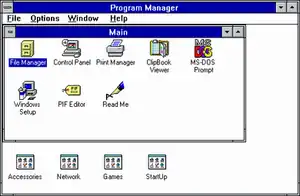Program Manager descends from Desktop Manager (also known as Presentation Manager), the shell for OS/2 1.2.[3] Unlike Desktop Manager, which presents its program groups in a simple list, and opens each group in a separate window, Program Manager opens program groups in child windows using the new multiple document interface in Windows 3.x. The icons used to represent Program Manager itself, program groups, and DOS applications in Windows 3.0 are carried over from OS/2 1.2. Windows 3.1 uses updated versions of these icons.