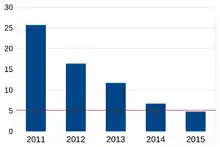 The error rate of AI by year. Red line - the error rate of a trained human on a particular task.