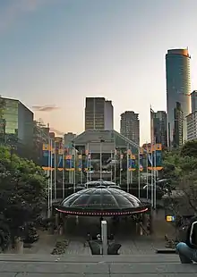 The project began as The British Columbia Centre, a provincial government project to replace the neo-Classical courthouse forming the northern of the three Robson Square blocks which now houses the Vancouver Art Gallery. The proposed 50-storey tower, at 208 metres (682 feet), would have been the tallest skyscraper in the city (and taller than the Living Shangri-La, which holds the record as of 2011). In 1972 the provincial government of WAC Bennett was defeated by the NDP government of Dave Barrett. Just as the tower's construction phase was about to begin the plan was scrapped and Arthur Erickson Architects was commissioned to create a new design in 1973. The concept was revised into a "horizontal highrise",[1] "B.C. Centre on its back."[2] The inspiration for this has been credited both to the architect and to the government minister responsible for the courts.[3] The building opened in 1980.