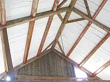 Common purlins in wood construction, also called a "major-rafter minor-purlin system".[3] Common purlins are typically "trenched through" the top sides (backs) of principal rafters and carry vertical roof sheathing (the key to identifying this type of roof system). Common purlin roofs in North America are found in areas settled by the English and may have been a new invention in the Massachusetts Bay Colony. No examples of framed buildings with common purlin roofs have been reported in England, however some stone barns in England have vertically boarded, common purlin roofs. Historically, these roofs are found in New England, the highest concentration in Maine, and isolated parts of New York and along the St. Lawrence River in Canada. One of the oldest surviving examples is in the Coffin House in Newbury, Massachusetts, from 1678. The purpose of a common purlin roof may be they allow a board roof, that is a roof of nothing but vertically laid boards with seams covered with battens or another layer of boards.[4]