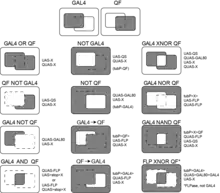 A variety of expression patterns may be achieved by combination of the three binary expression systems and the FLP/FRT or other recombinases.[10] Expression patterns may be constructed as AND, OR, NOR etc. logic gates [1][2] to e.g. narrow down expression patterns of available GAL4 lines. The resulting expression pattern somewhat depends on the developmental timing of activation of the transcription factors (discussed in [1]).