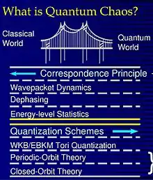 Quantum chaos is the field of physics attempting to bridge the theories of quantum mechanics and classical mechanics. The figure shows the main ideas running in each direction.