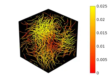 For temperatures low enough for quantum mechanical effects to govern the fluid, quantum turbulence is a seemingly chaotic tangle of vortex lines with a highly knotted topology, which move each other and reconnect when they collide. In a pure superfluid, there is no normal component to carry the entropy of the system and therefore the fluid flows without viscosity, resulting in the lack of a dissipation scale . Analogously to classical fluids, a quantum length scale (and the corresponding value in k-space ) can be introduced by replacing the kinematic viscosity in the Kolmogorov length scale with the quantum of circulation .[2] For scales larger than , a small polarisation of the vortex lines allows the stretching required to sustain a Kolmogorov energy cascade.