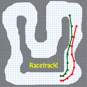 Racetrack is a paper and pencil game that simulates a car race, played by two or more players. The game is played on a squared sheet of paper, with a pencil line tracking each car's movement. The rules for moving represent a car with a certain inertia and physical limits on traction, and the resulting line is reminiscent of how real racing cars move. The game requires players to slow down before bends in the track, and requires some foresight and planning for successful play. The game is popular as an educational tool teaching vectors.