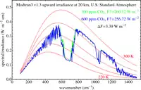Radiative forcing for doubling CO2, as calculated by radiative transfer code Modtran. Red lines are Planck curves.
