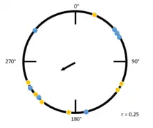 The example to the left is a Raleigh plot that has a high r value. Blue and yellow dots indicate individuals from different groups being tested, and the position of the dots indicate in which angle from magnetic north each tested individual is traveling. Due to the high overall concentration of individuals going at an angle between zero degrees and ninety degrees, the mean vector is much longer. Compare the figure to the left with the figure below: