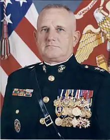 Smith next attended the Naval War College in Newport, Rhode Island, where he earned a master's degree in military science. While there, he also earned a master's degree in international relations from Salve Regina College. In July 1985, he reported to Headquarters Marine Corps for assignments in training and then in Operations. Returning to Camp Lejeune in May 1988, Lieutenant colonel Smith took command of the 8th Marine Regiment from colonel John J. Sheehan on 17 May 1988. He was promoted to Colonel in November 1988. Smith relinquished command of 8th Marines to Col Larry S. Schmidt on 19 June 1990.[4] In July 1990, Colonel Smith was assigned to the Joint Staff at The Pentagon where he was Chief, Asia-Pacific Branch, J5. He was selected for promotion to brigadier general in December 1991.