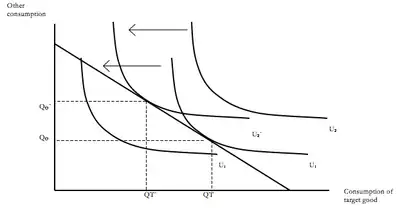 For cost reducing resource efficiency, distinguishing between direct and indirect effects is shown in Figure 1 below. The horizontal axis shows units of consumption of the targets good (which could be for example clothes washing, and measured in terms of kilograms of clean clothes) with consumption of all other goods and services on the vertical axis. An economical technology change that enables each unit of washing to be produced with less electricity results in a reduction of the price per unit of washing. This shifts the household budget line rightwards. The result is a substitution effect because of the decreased relative price, but also an income effect due to the increased real income. The substitution effect increases consumption of washing from Q1 to QS, and the income effect from QS to Q2. The total increase in consumption of washing from Q1 to Q2 and the resulting increase in electricity consumption is the direct effect. The indirect effect comprises the increase in other consumption, from O1 to O2. The scale of each of these effects depends on the elasticity of demand for each of the goods, and the embodied resource or externality associated with each good. Indirect effects are difficult to measure empirically.[19] In the manufacturing sector, it has been estimated that there is about a 24% rebound effect due to increases in fuel efficiency.[19] A parallel effect will happen for cost saving efficient technologies for producers, where output and substitution effects will occur.