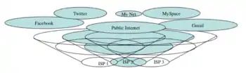 DIFs, being DAFs, in turn use other underlying DIFs themselves, going all the way down to the physical layer DIF controlling the wires and jacks. This is where the recursion of RINA comes from. All RINA layers have the same structure and components and provide the same functions; they differ only in their scopes, configurations or policies (mirroring the separation of mechanism and policy in operating systems).[3] As shown in Figure 2, RINA networks are usually structured in DIFs of increasing scope. Figure 3 shows an example of how the Web could be structured with RINA: the highest layer is the one closest to applications, corresponding to email or websites; the lowest layers aggregate and multiplex the traffic of the higher layers, corresponding to ISP backbones. Multi-provider DIFs (such as the public Internet or others) float on top of the ISP layers. In this model, three types of systems are distinguished: hosts, which contain DAPs; interior routers, internal to a layer; and border routers, at the edges of a layer, where packets go up or down one layer.