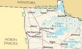 The Red Lake River (French: Rivière du Lac Rouge; Ojibwe: Miskwaagamiiwi-zaaga'iganiiwi-ziibi) is a river located in northwestern Minnesota. The river begins on the western side of the Lower Red Lake and flows westward. After passing through Thief River Falls, Red Lake Falls, and Crookston, the river merges with the Red River of the North in East Grand Forks. The total length of the river is 193 miles (311 km)[1] The term "Forks" in Grand Forks comes from this forking (confluence) of the Red and Red Lake rivers near downtown Grand Forks.[2]