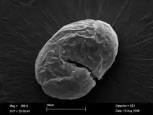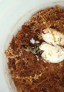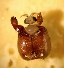 Eggs are tiny and oval-shaped, remaining the same size for around a week. After one week, the egg assumes the shape of an embryo and forms as a larva when the egg shell is removed.[46] Larvae measure 3 mm (0.12 in).[47] They show a similar appearance to S. geminata larvae, but they can be distinguished by the integument with spinules on top of the dorsal portion of the posterior somites. The body hairs measure 0.063 to 0.113 mm (0.0025 to 0.0044 in) with a denticulate tip. The antennae both have two or three sensilla. The labrum is smaller with two hairs on the anterior surface that are 0.013 mm (0.00051 in). The maxilla has a sclerotised band between the cardo and stipes. The labium also has a small sclerotised band.[47] The tubes of the labial glands are known to produce or secrete a proteinaceous substance that has a rich level of digestive enzymes, which includes proteases and amylases that function as an extraintestinal digestion of solid food. The midgut also contains amylases, roteases and upases. The narrow cells in its reservoir have little to no function in secretion.[48] The pupae resemble adults of any caste, except that their legs and antennae are held tightly against the body. They appear white, but over time, the pupa turns darker when they are almost ready to mature.[3]