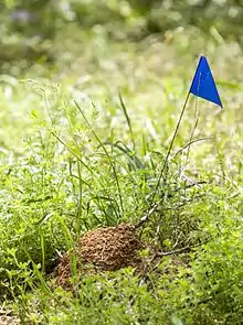Mounds range from small to large, measuring 10 to 60 cm (3.9 to 23.6 in) in height and 46 cm (18 in) in diameter with no visible entrances.[87][94] Workers are only able to access their nests through a series of tunnels that protrude from the central region. Such protrusions can span up to 25 feet away from the central mound, either straight down in to the ground or, more commonly, sideways from the original mound.[95] Constructed from soil, mounds are oriented so that the long portions of the mound face toward the sun during the early morning and before sunset.[87][94] Mounds are usually oval-shaped with the long axis of the nest orientating itself in a north–south direction.[96] These ants also spend large amounts of energy in nest construction and transporting brood, which is related with thermoregulation. The brood is transported to areas where temperatures are high; workers track temperature patterns of the mound and do not rely on behavioural habits.[97] Inside nests, mounds contain a series of narrow horizontal tunnels, with subterranean shafts and nodes reaching grass roots 10 to 20 cm (3.9 to 7.9 in) below the surface; these shafts and nodes connect the mound tunnels to the subterranean chambers. These chambers are about 5 cm2 (0.77 inch2) and reach depths of 10 to 80 cm (3.9 to 31.5 in). The mean number of ants in a single subterranean chamber is around 200.[98][99][100]
