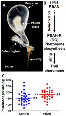 The glandular system contains four glands: the mandibular, maxillary, labial, and postpharyngeal glands.[61] The postpharyngeal is well developed in the queen, while the other glands are larger in workers. The postpharyngeal gland functions as a vacuum to absorb fatty acids and triglycerides, as well as a gastric caecum.[67] The functions of the other glands remain poorly understood. In one study discussing the enzymes of the digestion system of adult ants, lipase activity was found in the mandibular and labial glands, as well as invertase activity. The Dufour's gland found in the ant acts as a source of trail pheromones, although scientists believed the poison gland was the source of the queen pheromone.[61][68][69] The neurohormone pheromone biosynthesis activating neuropeptide is found in the ant that activates the biosynthesis of pheromones from the Dufour's gland.[70] The spermatheca gland is found in queens, which functions in sperm maintenance. Males appear to lack these glands, but those associated with its head are morphologically similar to those found in workers, but these glands may act differently.[67]