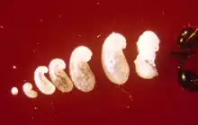 Four larval instars have been described based on distinctive morphological characters.[46][49][50] The larvae of the minor and major workers are impossible to distinguish before the final instar, when size differences become apparent.[50] Upon pupation a wider head width difference between castes become more evident. Reproductive larvae are larger than worker larvae, and present discrete morphological differences in mouthparts.[50] Fourth-instar larvae of males and queens can be differentiated based on their relative shape and body coloration,[50] and also internal gonopodal imaginal discs can differ.