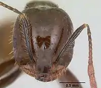Red imported fire ant workers range in size from small to medium, making them polymorphic. Workers measure between 2.4 and 6.0 mm (0.094 and 0.236 in).[43] The head measures 0.66 to 1.41 mm (0.026 to 0.056 in) and is 0.65 to 1.43 mm (0.026 to 0.056 in) wide. In the larger workers (as in the major workers), their heads measure 1.35 to 1.40 mm (0.053 to 0.055 in) and 1.39 to 1.42 mm (0.055 to 0.056 in) wide. The antenna scapes measure 0.96 to 1.02 mm (0.038 to 0.040 in) and the thoracic length is 1.70 to 1.73 mm (0.067 to 0.068 in).[24] The head becomes wider behind the eyes with rounded occipital lobes present, and unlike the similar-looking S. richteri, the lobes peak further than the midline, but the occipital excision is not as crease-like. The scapes in major workers do not extend beyond occipital peak by one or two scape diameters; this feature is more noticeable in S. richteri. In medium-sized workers, the scapes reach the occipital peaks and exceed the rear border in the smallest workers. In small and medium workers, the head tends to have more elliptical sides. The head of small workers is wider out front than it is behind.[24] In the major workers, the pronotum does not have any angular shoulders, nor does it have any sunken posteromedian area. The promesonotum is convex and the propodeum base is rounded and also convex. The base and declivity are of equal length. The suture of the promesonotum is either strong or weak in larger workers. The petiole has a thick and blunt scale; if observed from behind, it is not as rounded above in contrast to S. richteri, and sometimes it may be subtruncate. The postpetiole is large and broad, and in the larger workers, it is broader than its length. The postpetiole tends to be less broad in front and broader behind. On the rear side of the dorsal surface, a transverse impression is present. In S. richteri, this feature is also present but much weaker.[24]