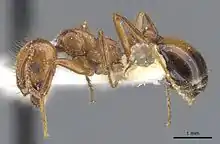 The red imported fire ant was first described by Swiss entomologist Felix Santschi in a 1916 journal article published by Physis.[17] Originally named Solenopsis saevissima wagneri from a syntype worker collected from Santiago del Estero, Argentina, Santschi believed the ant was a variant of S. saevissima; the specific epithet, wagneri, derives from the surname of E.R. Wagner, who collected the first specimens.[18] The type material is currently housed in Naturhistorisches Museum Basel, Switzerland, but additional type workers are possibly housed in the Muséum national d'histoire naturelle, Paris.[19] In 1930, American myrmecologist William Creighton reviewed the genus Solenopsis and reclassified the taxon as Solenopsis saevissima electra wagneri at infrasubspecific rank, noting that he could not collect any workers that referred to Santschi's original description.[20] In 1952, the S. saevissima species complex was examined and, together with nine other species-group names, S. saevissima electra wagneri was synonymised with S. saevissima saevissima.[21] This reclassification was accepted by Australian entomologist George Ettershank in his revision of the genus and in Walter Kempf's 1972 catalogue of Neotropical ants.[22][23]