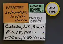 In 1972, American entomologist William Buren described what he thought was a new species, naming it Solenopsis invicta.[24] Buren collected a holotype worker from Cuiabá in Mato Grosso, Brazil, and provided the first official description of the ant in a journal article published by the Georgia Entomological Society. He accidentally misspelled invicta as invica [sic] above the description pages of the species, although it was clear that invicta was the intended spelling because of the constant use of the name in the article.[25] The type material is currently housed in the National Museum of Natural History, Washington, D.C.[24]