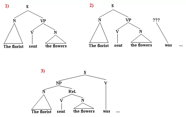 In sentences such as this, when the reader or hearer encounters the verb (in this case, raced) he or she can interpret it in two different ways: as a main verb, or the first verb of a reduced relative clause. Linguist David W. Carrol gives the example of "the florist sent...", which could either go on to form a sentence such as "the florist sent the flowers to the elderly widow" (in which "sent" is the main verb), or one such as "the florist [who was] sent the flowers was very pleased" (in which "sent" is the beginning of a reduced relative clause).[4] Sentences like this often produce a garden path effect—an effect whereby a reader begins a sentence with one interpretation, and later is forced to backtrack and re-analyze the sentence's structure.[8] The diagram below illustrates the garden path effect in the sentence "the florist sent the flowers was pleased," where (1) represents the initial structure assigned to the sentence, (2) represents the garden path effect elicited when the reader encounters "was" and has nowhere to put it, and (3) represents the re-analysis of the sentence as containing a reduced relative clause.