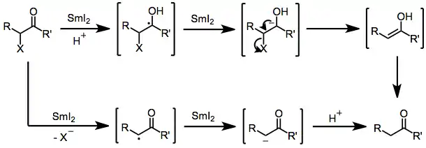 α-Functionalized carbonyl compounds are reduced to the corresponding unfunctionalized carbonyl compounds in the presence of samarium(II) iodide. This process may be initiated by initial electron transfer to either the substituent at the α position or the carbonyl moiety, depending on the relative electron affinity of the functional groups. A second reduction immediately follows, after which either protonation or elimination-tautomerization affords the product.[13]